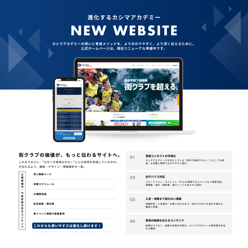 カシマアカデミーFCでは、選手の年齢や成長段階に合わせた3つのカテゴリーをご用意しています。 それぞれの段階で最適な指導を行い、サッカーを通じて人間的にも成長できる環境を提供します。 途中からの入会も随時受け付けておりますので、お気軽にお問い合わせください。